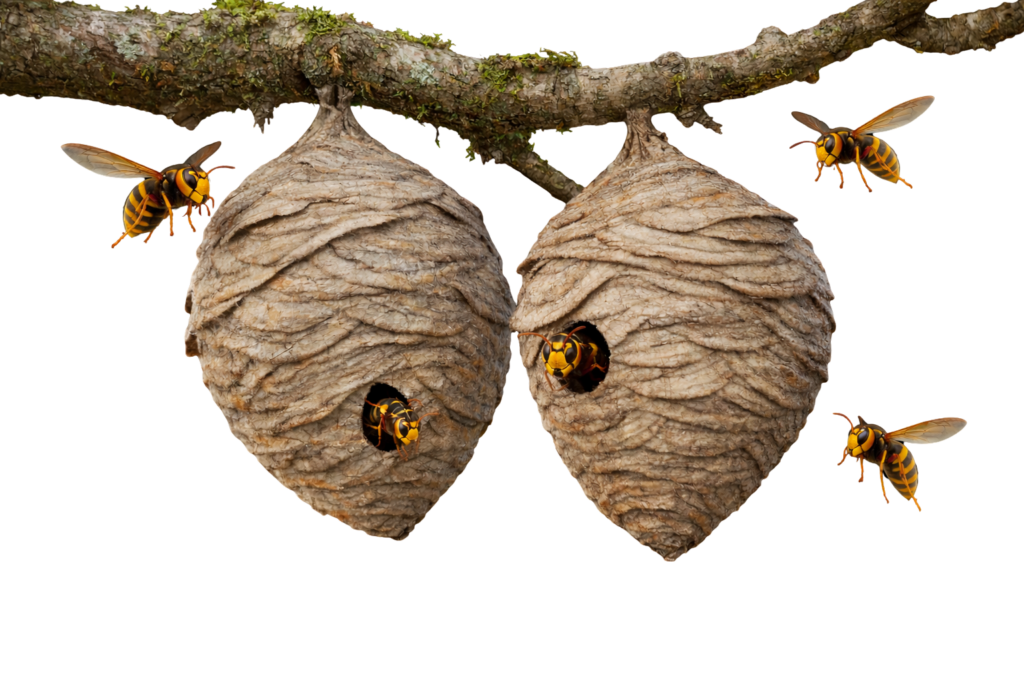 - Nid Visible : Un nid de frelon ou de guêpe est visible sur un arbre, un mur, un toit, un support extérieur…..